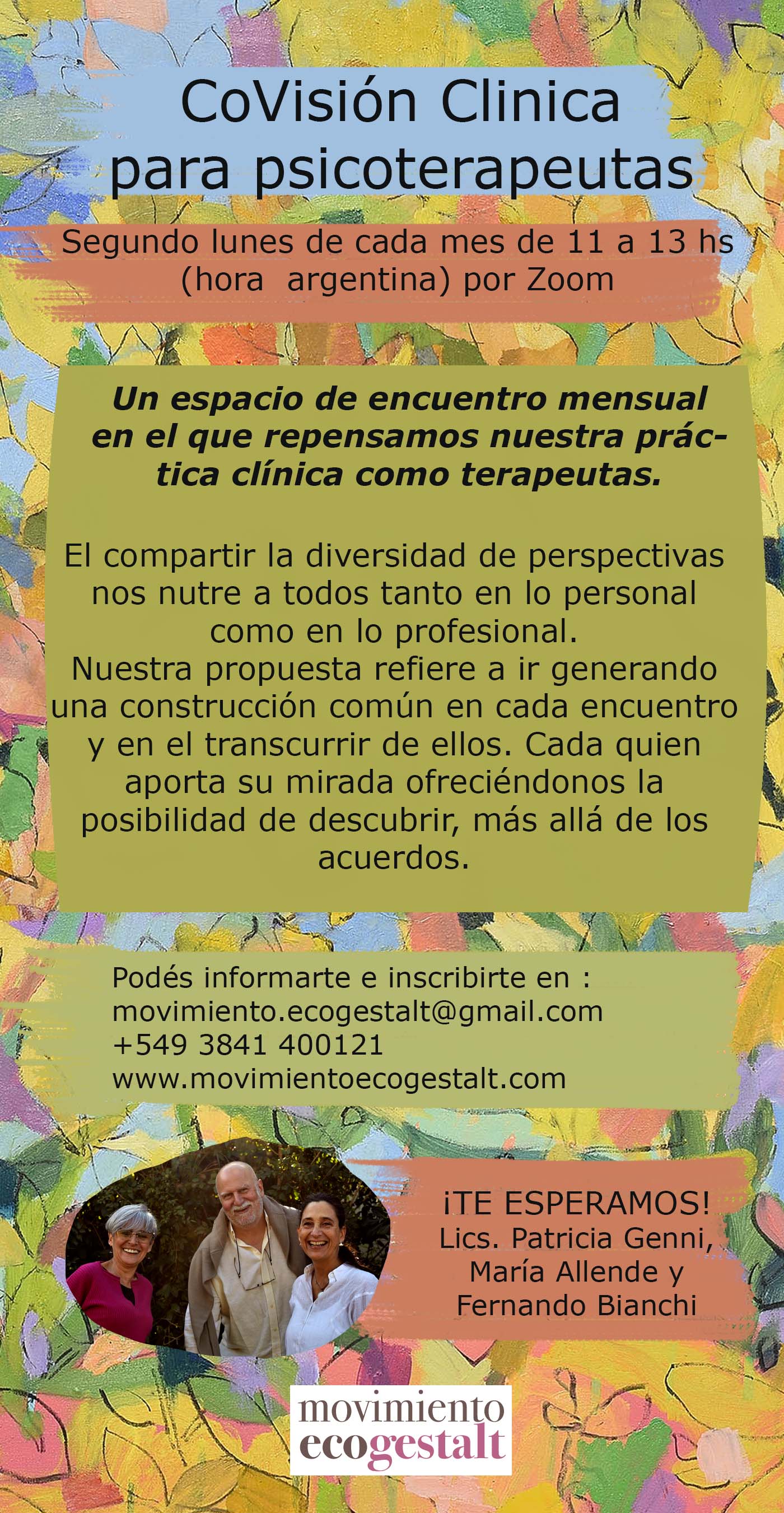 Nuestra amistad nos permitió constituirnos en un sólido equipo de trabajo con distintas especializaciones en el ámbito clínico, docente y organizacional. Compartimos el inicio de Movimiento EcoGestalt con nuestra entrañable amiga y colega, la Lic. Nora Spinetto agradecemos a la vida tantos encuentros plenos de sabiduría y humor.